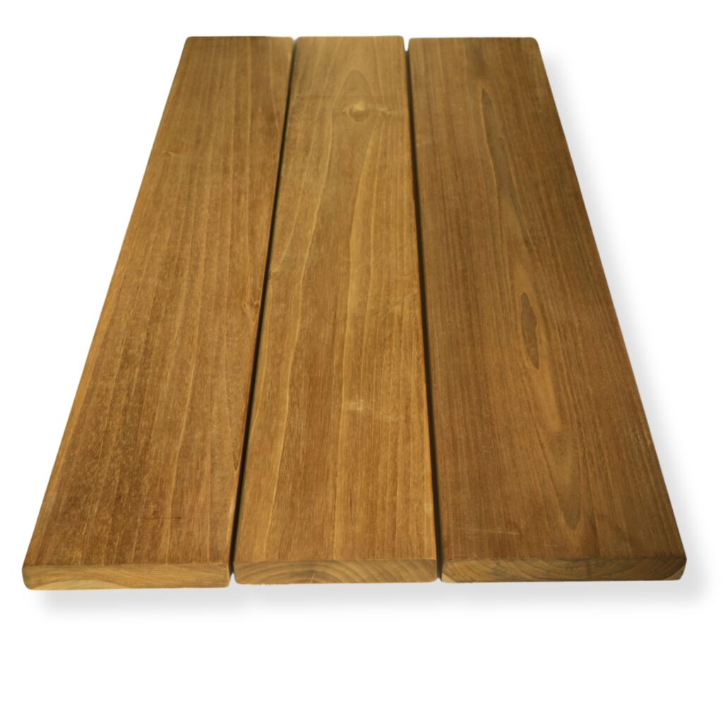 Teak decking Go Back Description Our teak decking is perfect for outdoor spaces, offering durability and a natural finish that enhances any area. Our decking is available as : Dimension:21 mm (thickness) × 95 mm / 120 mm / 145 mm (width) More information